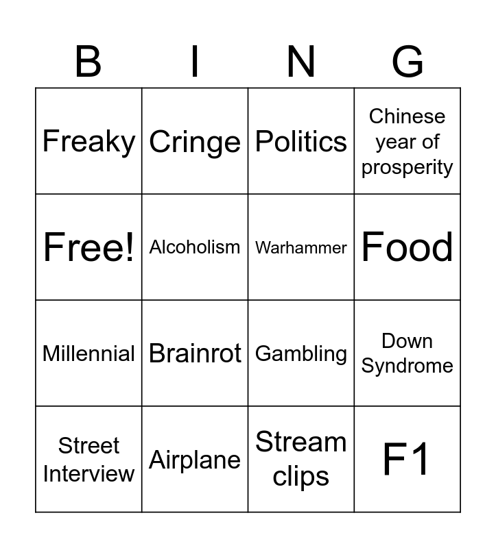 This bingo card has 16 words: Airplane, Down Syndrome, Politics, Freaky, Millennial, Cringe, Gambling, Stream clips, Free!, Alcoholism, Street Interview, Chinese year of prosperity, Brainrot, Food, Warhammer and F1.