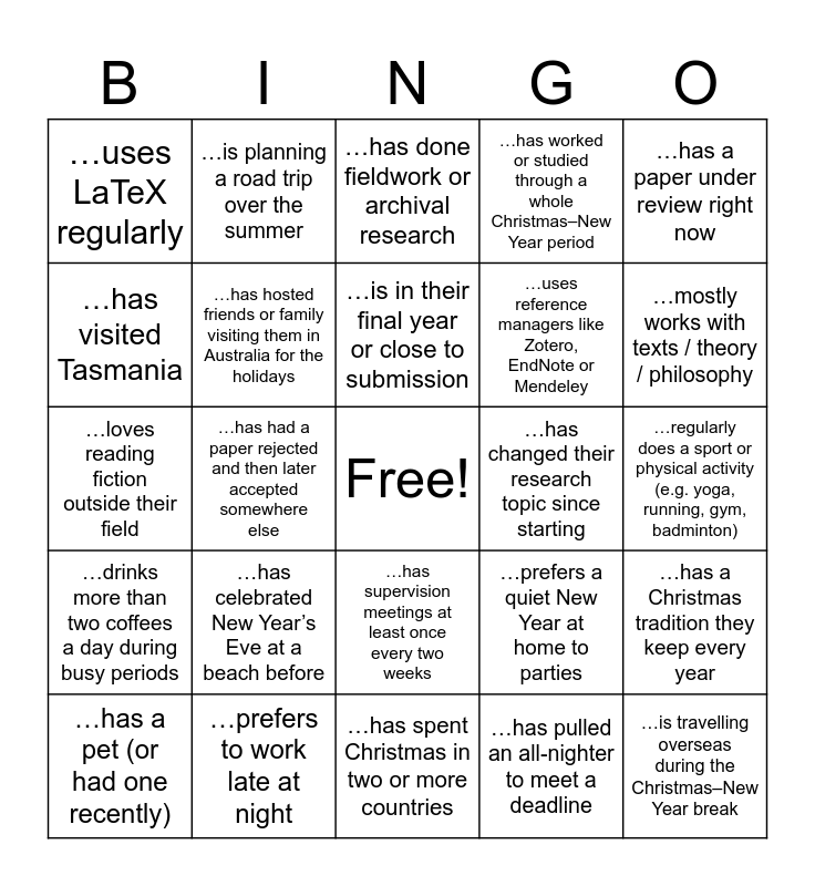 This bingo card has a free space and 50 words: …is travelling interstate during the Christmas–New Year break, …is travelling overseas during the Christmas–New Year break, …is staying in Sydney for Christmas, …has spent Christmas in two or more countries, …has celebrated New Year’s Eve at a beach before, …has watched the Sydney Harbour New Year’s Eve fireworks in person, …is planning a road trip over the summer, …has gone camping or hiking over a Christmas / New Year break, …has visited Tasmania, …has visited New Zealand, …has hosted friends or family visiting them in Australia for the holidays, …has worked or studied through a whole Christmas–New Year period, …has a Christmas tradition they keep every year, …prefers a quiet New Year at home to parties, …has once missed midnight on New Year’s Eve because they fell asleep 😆, …is in their first year of their PhD/HDR, …is in their final year or close to submission, …has changed their research topic since starting, …has presented at a conference, …has a paper under review right now, …has had a paper rejected and then later accepted somewhere else, …has pulled an all-nighter to meet a deadline, …uses LaTeX regularly, …uses reference managers like Zotero, EndNote or Mendeley, …has taught a tutorial or workshop, …has given a 3-minute thesis (3MT) or similar short talk, …mostly works with texts / theory / philosophy, …mostly works with data / experiments / coding, …has done fieldwork or archival research, …has supervision meetings at least once every two weeks, …has cried (or almost cried) because of reviewer comments or feedback, …has ever cited a paper they didn’t fully read 🙈, …likes to write in cafés, …prefers to work very early in the morning, …prefers to work late at night, …plays a musical instrument, …sings in a choir or loves karaoke, …enjoys dancing (any style, from club to ballet), …enjoys swimming / snorkelling / the beach, …regularly does a sport or physical activity (e.g. yoga, running, gym, badminton), …likes cooking or baking to relax, …loves spicy food, …is vegetarian, vegan, or mostly plant-based, …speaks three or more languages, …has a pet (or had one recently), …loves reading fiction outside their field, …enjoys board games or card games, …prefers tea over coffee, …drinks more than two coffees a day during busy periods and …has a favourite TV show, anime or drama they could talk about for 10 minutes.