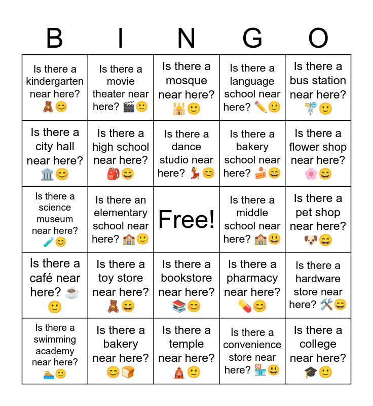 This bingo card has a free space and 30 words: Is there a bakery near here? ππ, Is there a church near here? ππ, Is there an elementary school near here? π«π, Is there a supermarket near here? ππ, Is there a kindergarten near here? π§Έπ, Is there a mosque near here? ππ, Is there a high school near here? ππ, Is there a bookstore near here? ππ, Is there a middle school near here? π«π, Is there a temple near here? ππ, Is there a pet shop near here? πΆπ, Is there a college near here? ππ, Is there a convenience store near here? πͺπ, Is there a music academy near here? π΅π, Is there a flower shop near here? πΈπ, Is there a library near here? ππ, Is there a pharmacy near here? ππ, Is there a cafΓ© near here? βπ, Is there a toy store near here? π§Έπ, Is there a bus station near here? ππ, Is there a science museum near here? π§ͺπ, Is there a gym near here? ποΈββοΈπ, Is there a movie theater near here? π¬π, Is there a bakery school near here? π°π, Is there a city hall near here? ποΈπ, Is there a language school near here? βοΈπ, Is there a hardware store near here? π οΈπ, Is there a swimming academy near here? ππ, Is there a dance studio near here? ππ and Is there a barber shop near here? ππ.