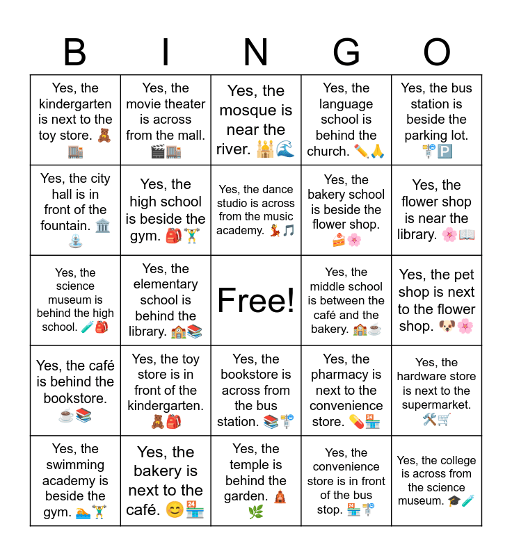 This bingo card has a free space and 30 words: Yes, the bakery is next to the cafΓ©. ππͺ, Yes, the church is across from the park. ππ³, Yes, the elementary school is behind the library. π«π, Yes, the supermarket is in front of the pharmacy. ππ, Yes, the kindergarten is next to the toy store. π§Έπ¬, Yes, the mosque is near the river. ππ, Yes, the high school is beside the gym. πποΈββοΈ, Yes, the bookstore is across from the bus station. ππ, Yes, the middle school is between the cafΓ© and the bakery. π«β, Yes, the temple is behind the garden. ππΏ, Yes, the pet shop is next to the flower shop. πΆπΈ, Yes, the college is across from the science museum. ππ§ͺ, Yes, the convenience store is in front of the bus stop. πͺπ, Yes, the music academy is beside the dance studio. π΅π, Yes, the flower shop is near the library. πΈπ, Yes, the library is across from city hall. πποΈ, Yes, the pharmacy is next to the convenience store. ππͺ, Yes, the cafΓ© is behind the bookstore. βπ, Yes, the toy store is in front of the kindergarten. π§Έπ, Yes, the bus station is beside the parking lot. ππ ΏοΈ, Yes, the science museum is behind the high school. π§ͺπ, Yes, the gym is next to the swimming academy. ποΈββοΈπ, Yes, the movie theater is across from the mall. π¬π¬, Yes, the bakery school is beside the flower shop. π°πΈ, Yes, the city hall is in front of the fountain. ποΈβ², Yes, the language school is behind the church. βοΈπ, Yes, the hardware store is next to the supermarket. π οΈπ, Yes, the swimming academy is beside the gym. πποΈββοΈ, Yes, the dance studio is across from the music academy. ππ΅ and Yes, the barber shop is next to the bakery. ππ.