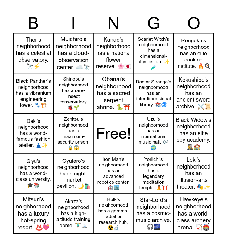 This bingo card has a free space and 33 words: Tanjiro’s neighborhood has a botanical garden. 🌿🌸, Nezuko’s neighborhood has a mental health hospital. 🏥🌙, Zenitsu’s neighborhood has a maximum-security prison. 🔒😱, Inosuke’s neighborhood has an ice-sculpture museum. ❄️🗿, Giyu’s neighborhood has a world-class university. 🎓📚, Shinobu’s neighborhood has a rare-insect conservatory. 🐞🌱, Rengoku’s neighborhood has an elite cooking institute. 🔥🍳, Mitsuri’s neighborhood has a luxury hot-spring resort. ♨️💖, Muichiro’s neighborhood has a cloud-observation center. ☁️🔭, Sanemi’s neighborhood has a wind-energy research lab. 💨🔬, Obanai’s neighborhood has a sacred serpent shrine. 🐍⛩️, Kanao’s neighborhood has a national flower reserve. 🌸🇯🇵, Tokito’s neighborhood has a meteor-tracking station. 🌠📡, Genya’s neighborhood has a wilderness survival school. 🌲🏕️, Uzui’s neighborhood has an international music hall. 🎶🌍, Kokushibo’s neighborhood has an ancient sword archive. ⚔️📜, Akaza’s neighborhood has a high-altitude training dome. 🏋️♂️🏔️, Daki’s neighborhood has a world-famous fashion atelier. 👗✨, Gyutaro’s neighborhood has a night-market pavilion. 🌙🛍️, Yoriichi’s neighborhood has a legendary meditation temple. 🧘⛩️, Iron Man’s neighborhood has an advanced robotics center. 🤖🏙️, Captain America’s neighborhood has a historic war museum. 🛡️🏛️, Thor’s neighborhood has a celestial observatory. 🔭⚡, Black Widow’s neighborhood has an elite spy academy. 🕵️♀️🏫, Hulk’s neighborhood has a gamma-radiation research hub. ☢️🔬, Hawkeye’s neighborhood has a world-class archery arena. 🏹🏟️, Scarlet Witch’s neighborhood has a dimensional-physics lab. ✨🧪, Doctor Strange’s neighborhood has an interdimensional library. 📚🌀, Black Panther’s neighborhood has a vibranium engineering tower. 🐾🏗️, Loki’s neighborhood has an illusion-arts theater. 🎭✨, Spider-Man’s neighborhood has a skyscraper-climbing gym. 🕷️🏋️, Star-Lord’s neighborhood has a cosmic-music archive. 🎧🌌 and Gamora’s neighborhood has a universal diplomatic embassy. 🌍🏛️.