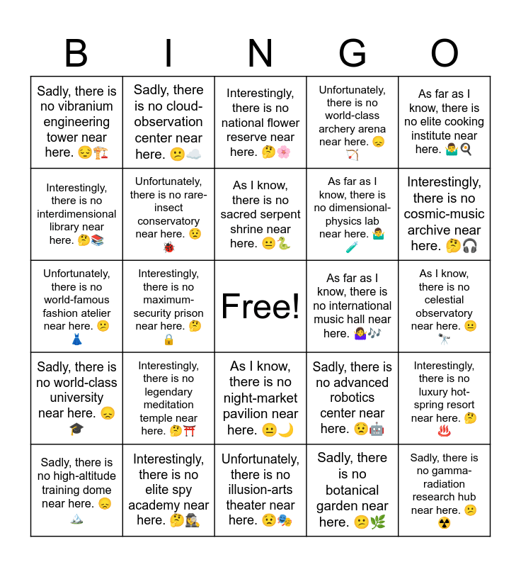 This bingo card has a free space and 32 words: Sadly, there is no botanical garden near here. ๐๐ฟ, Unfortunately, there is no mental health hospital near here. ๐๐ฅ, Interestingly, there is no maximum-security prison near here. ๐ค๐, As I know, there is no ice-sculpture museum near here. ๐โ๏ธ, Sadly, there is no world-class university near here. ๐๐, Unfortunately, there is no rare-insect conservatory near here. ๐๐, As far as I know, there is no elite cooking institute near here. ๐คทโโ๏ธ๐ณ, Interestingly, there is no luxury hot-spring resort near here. ๐คโจ๏ธ, Sadly, there is no cloud-observation center near here. ๐โ๏ธ, Unfortunately, there is no wind-energy research lab near here. ๐๐จ, As I know, there is no sacred serpent shrine near here. ๐๐, Interestingly, there is no national flower reserve near here. ๐ค๐ธ, Sadly, there is no meteor-tracking station near here. ๐๐ , Unfortunately, there is no wilderness survival school near here. ๐๐ฒ, As far as I know, there is no international music hall near here. ๐คทโโ๏ธ๐ถ, Interestingly, there is no ancient sword archive near here. ๐คโ๏ธ, Sadly, there is no high-altitude training dome near here. ๐๐๏ธ, Unfortunately, there is no world-famous fashion atelier near here. ๐๐, As I know, there is no night-market pavilion near here. ๐๐, Interestingly, there is no legendary meditation temple near here. ๐คโฉ๏ธ, Sadly, there is no advanced robotics center near here. ๐๐ค, Unfortunately, there is no historic war museum near here. ๐๐๏ธ, As I know, there is no celestial observatory near here. ๐๐ญ, Interestingly, there is no elite spy academy near here. ๐ค๐ต๏ธโโ๏ธ, Sadly, there is no gamma-radiation research hub near here. ๐โข๏ธ, Unfortunately, there is no world-class archery arena near here. ๐๐น, As far as I know, there is no dimensional-physics lab near here. ๐คทโโ๏ธ๐งช, Interestingly, there is no interdimensional library near here. ๐ค๐, Sadly, there is no vibranium engineering tower near here. ๐๐๏ธ, Unfortunately, there is no illusion-arts theater near here. ๐๐ญ, As I know, there is no skyscraper-climbing gym near here. ๐๐ท๏ธ and Interestingly, there is no cosmic-music archive near here. ๐ค๐ง.