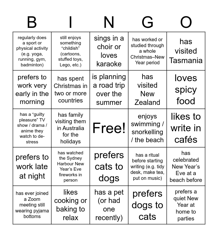 This bingo card has a free space and 38 words: is travelling interstate during the Christmas–New Year break, is travelling overseas during the Christmas–New Year break, is staying in Sydney for Christmas, has spent Christmas in two or more countries, has celebrated New Year’s Eve at a beach before, has watched the Sydney Harbour New Year’s Eve fireworks in person, is planning a road trip over the summer, has gone camping or hiking over a Christmas / New Year break, has visited Tasmania, has visited New Zealand, has family visiting them in Australia for the holidays, has worked or studied through a whole Christmas–New Year period, prefers a quiet New Year at home to parties, likes to write in cafés, prefers to work very early in the morning, prefers to work late at night, plays a musical instrument, sings in a choir or loves karaoke, enjoys dancing (any style, from club to ballet), enjoys swimming / snorkelling / the beach, regularly does a sport or physical activity (e.g. yoga, running, gym, badminton), likes cooking or baking to relax, loves spicy food, has ever joined a Zoom meeting still wearing pyjama bottoms, speaks three or more languages, has a pet (or had one recently), loves reading fiction outside their field, enjoys board games or card games, prefers tea over coffee, drinks more than two coffees a day during busy periods, has a favourite TV show, anime or drama they could talk about for 10 minutes, prefers cats to dogs, prefers dogs to cats, still enjoys something “childish” (cartoons, stuffed toys, Lego, etc.), has a favourite animal and a reason why, has a ritual before starting writing (e.g. tidy desk, make tea, put on music), has a “guilty pleasure” TV show / drama / anime they watch to de-stress and has a non-academic dream job they sometimes think about.