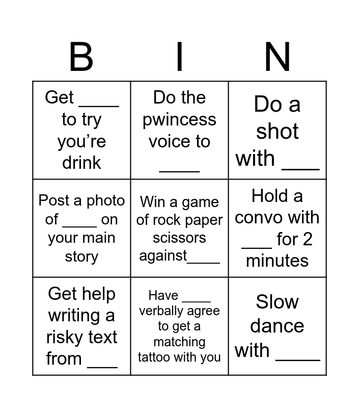 This bingo card has a free space and 8 words: Hold a convo with ___ for 2 minutes, Do a shot with ___, Do the pwincess voice to ____, Get help writing a risky text from ___, Get ____ to try you’re drink, Slow dance with ____, Post a photo of ____ on your main story and Have ____ verbally agree to get a matching tattoo with you.