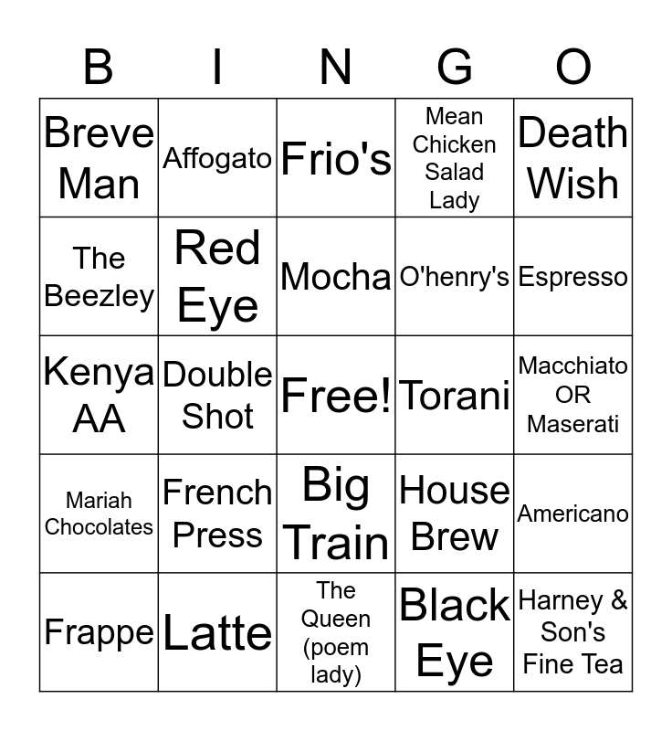 This bingo card has a free space and 24 words: French Press, Latte, Mocha, Frappe, Death Wish, Breve Man, The Beezley, Affogato, Torani, Big Train, O'henry's, Kenya AA, House Brew, Americano, Red Eye, Black Eye, Macchiato OR Maserati, Frio's, Espresso, Double Shot, Harney & Son's Fine Tea, Mariah Chocolates, Mean Chicken Salad Lady and The Queen (poem lady).