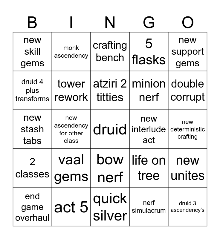 This bingo card has a free space and 24 words: vaal gems, act 5, atziri 2 titties, end game overhaul, new support gems, new skill gems, druid 4 plus transforms, monk ascendency, new interlude act, bow nerf, minion nerf, new stash tabs, life on tree, new unites, tower rework, nerf simulacrum, new deterministic crafting, crafting bench, double corrupt, new ascendency for other class, druid 3 ascendency's, 2 classes, 5 flasks and quick silver.