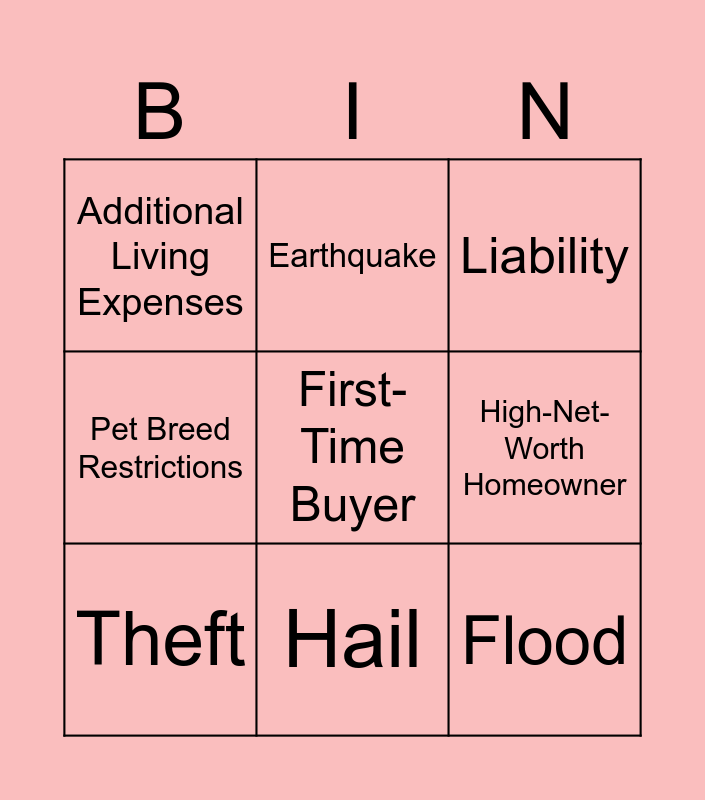 This bingo card has 16 words: Dwelling, Personal Property, Liability, Additional Living Expenses, Flood, Earthquake, Premium, Deductible, First-Time Buyer, High-Net-Worth Homeowner, Claims History, Pet Breed Restrictions, Wildfire, Hail, Theft and QBE California Exit.