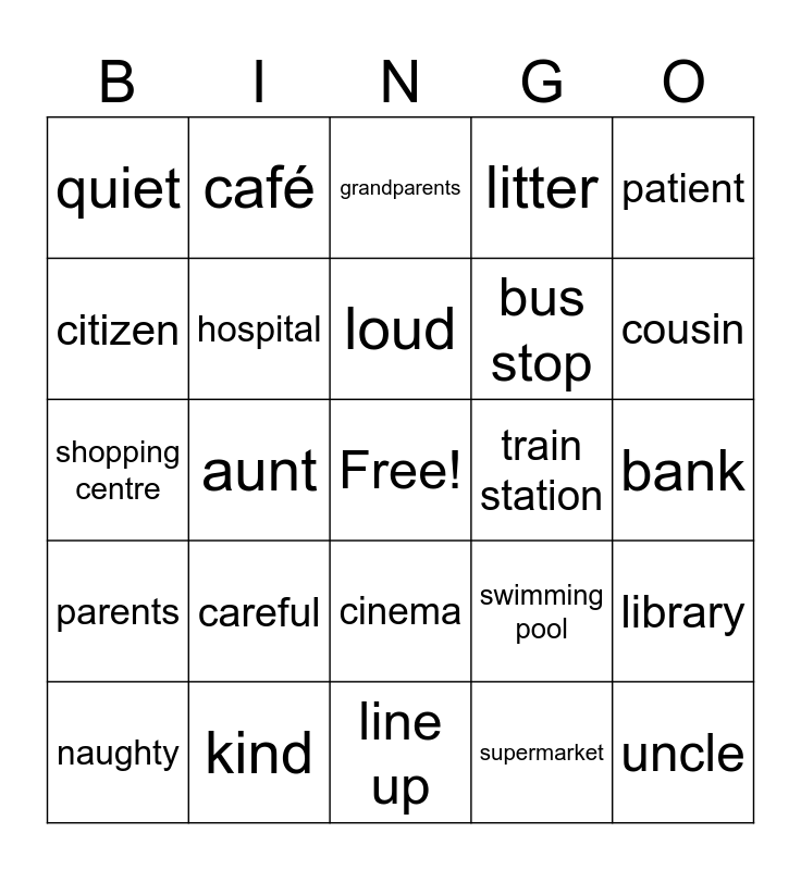 This bingo card has a free space and 24 words: careful, kind, loud, naughty, patient, quiet, citizen, café, train station, cinema, bus stop, shopping centre, swimming pool, library, hospital, supermarket, bank, grandparents, cousin, aunt, uncle, parents, litter and line up.