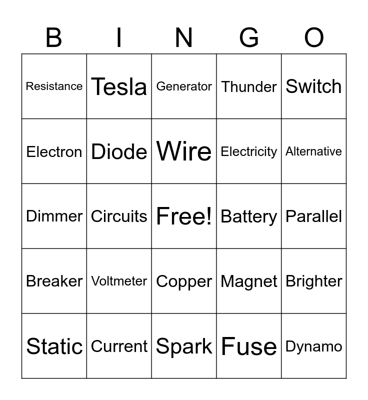 This bingo card has a free space and 24 words: Voltmeter, Current, Wire, Static, Switch, Resistance, Electron, Tesla, Battery, Copper, Electricity, Dimmer, Magnet, Brighter, Diode, Fuse, Parallel, Generator, Alternative, Circuits, Dynamo, Breaker, Thunder and Spark.