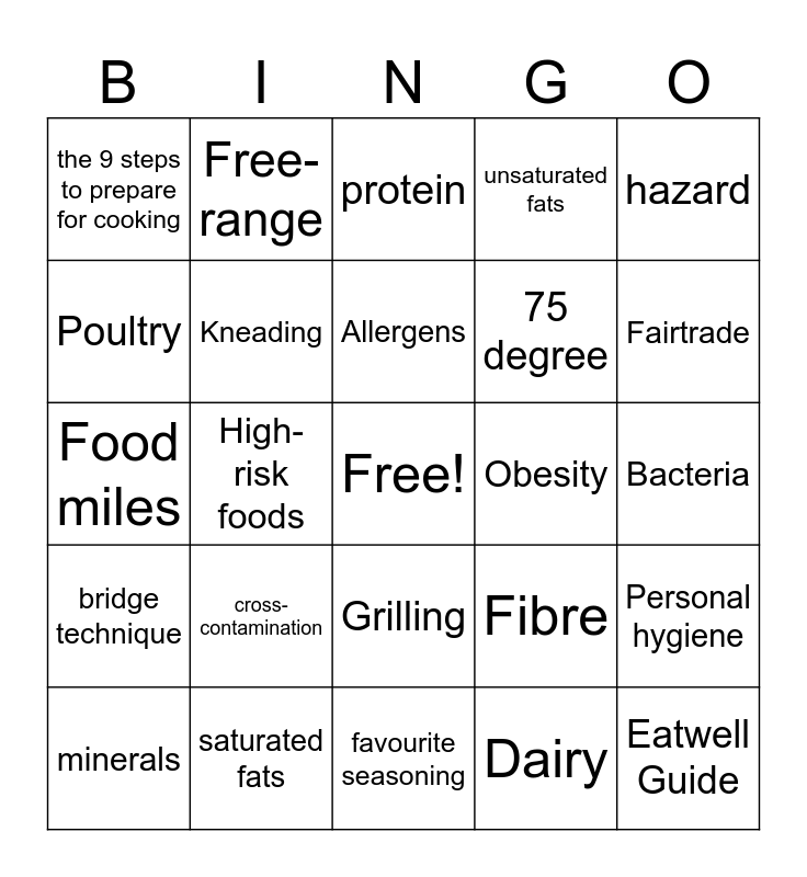 This bingo card has a free space and 34 words: Food waste, Dairy, Claw grip, Protein, bridge technique, Kneading, hazard, minerals, Free-range, vitamins, Allergens, protein, what is an example of good hygiene, Listeria, Obesity, Fairtrade, saturated fats, Food miles, cross-contamination, Fibre, Grilling, Quality control, the 9 steps to prepare for cooking, Bacteria, favourite seasoning, Eatwell Guide, unsaturated fats, HACCP, 75 degree, Poultry, Boiling, High-risk foods, Personal hygiene and Carbohydrates.