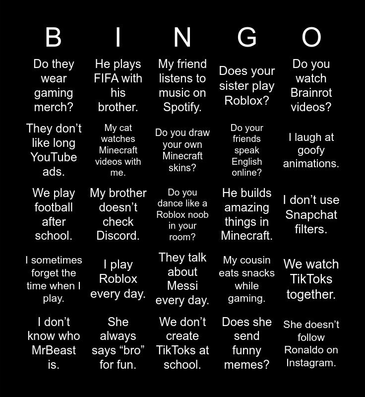 This bingo card has a free space and 24 words: I play Roblox every day., She always says “bro” for fun., Do you draw your own Minecraft skins?, I don’t know who MrBeast is., Do you watch Brainrot videos?, Do they wear gaming merch?, They don’t like long YouTube ads., He plays FIFA with his brother., He builds amazing things in Minecraft., They talk about Messi every day., Do your friends speak English online?, We play football after school., My cousin eats snacks while gaming., We watch TikToks together., My cat watches Minecraft videos with me., Does she send funny memes?, I don’t use Snapchat filters., My friend listens to music on Spotify., I laugh at goofy animations., My brother doesn’t check Discord., She doesn’t follow Ronaldo on Instagram., I sometimes forget the time when I play., Does your sister play Roblox? and We don’t create TikToks at school..