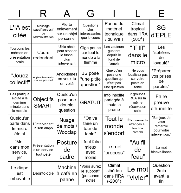 This bingo card has a free space and 57 words: Courage managérial, "Préparer vos prises de paroles", Agilité, L'IA est citée, Objectifs SMART, Il faut faire mieux avec moins, SG d'EPLE, L'intervenant nous fait son CV, Cours redondant, Le mot "process", Questions plus intéressantes que le cours, "Moi, dans mon service, je", Quelqu'un parle dans le micro éteint, Faire preuve d'humilité, Machine à café en panne, L’intervenant lit son diapo, Panne du matériel technique / du WIFI, Les vautours guettent depuis le fond de l'amphi, Queue à Senghor, "fff fff" dans le micro, Les "sphères de loyauté", Nuage de mots / Wooclap, Quelqu'un pose une question qui n'est pas une question, Alerte enlèvement sur un objet personnel, Bip du Gristage 45min après le début du cours, Toujours les mêmes en présentation orale, 2 groupes RCA sur la même réservation salle, Elias avec un sandwich / une Cristalline, Ulkia aboie pour stopper le tunnel d'un intervenant, "On va faire un tour de table", Brise-glace / jeu sérieux, "Bonjour. Je vous remercie pour votre intervention.", Déontologie, "Vous aurez le support" (personne note), "Jouez collectif", Climat tropical dans l'IRA (50C°), Présentation d'un service tout pété, Giga pause car tout le monde a la flemme, Posture de cadre, Applaudissements pour couper court, Message passif agressif de l'administration, JS pose "une p'tite question", Question 2min avant la fin, CQQCOQP, Le mot bienveillance, Le diapo est imbuvable, Anglicismes en veux-tu en voilà, Cas pratique ajouté à la dernière minute dans le module, Climat sibérien dans l'IRA (-20C°), Éternuements étranges au fond de l'amphi, Info insolite partagée à toute la promo, Quelqu'un pose une double question, Tout le monde s'endort, "Au fil de l'eau", Le mot "vivier", Ne vous focalisez pas sur votre poste en sortie and Votre expertise c'est d'être généraliste.