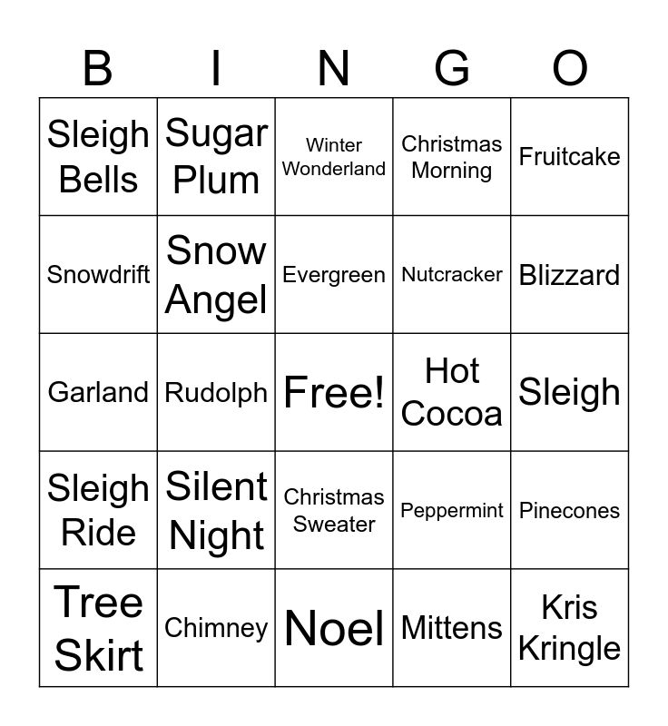 This bingo card has a free space and 100 words: Santa, Reindeer, Sleigh, Elf, North Pole, Snowman, Snowflake, Mistletoe, Wreath, Holly, Jingle Bells, Candy Cane, Stocking, Chimney, Fireplace, Gingerbread, Nutcracker, Tinsel, Ornament, Christmas Tree, Wrapping Paper, Presents, Ribbon, Bow, Icicles, Hot Cocoa, Fruitcake, Peppermint, Carolers, Frosty, Rudolph, Sleigh Bells, Snow Boots, Scarf, Mittens, Evergreen, Pinecones, Candle, Cookies, Eggnog, Yule Log, Christmas Lights, Garland, Snow Globe, Blizzard, Winter Wonderland, Festive, Holiday Spirit, Joy, Noel, Peace, Goodwill, Nativity, Star, Angel, Shepherd, Bethlehem, Three Wise Men, Christmas Eve, Christmas Morning, Advent, Sledding, Winter Hat, Snowball, Poinsettia, Caroling, Cookies & Milk, Happy Holidays, Magic, Reindeer Games, North Star, Silent Night, Frostbite, Evergreen Tree, Santa’s Workshop, Candy, Warm Blankets, Snowdrift, Holly Jolly, Toys, Gingerbread House, Kris Kringle, Stocking Stuffer, Christmas Sweater, Holiday Cheer, Sugar Plum, Festive Feast, Chimney Smoke, Pine Needles, Sleigh Ride, Snowy Path, Winter Coat, Santa Hat, Tree Skirt, Snow Angel, Reindeer Antlers, Christmas Carol, Blizzard Breeze, Family Gathering and Twinkling Lights.