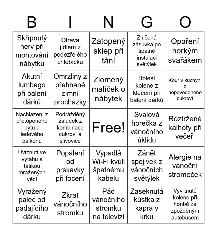 This bingo card has a free space and 53 words: Zlomený kotník na zamrzlém chodníku, Vyvrtnuté koleno při honbě za zpožděným autobusem, Pochroumaná záda z tahání vánočního stromku, Zaseknutá kůstka z kapra v krku, Popálení od prskavky při focení, Prst pořezaný při porcování bramborového salátu, Otrava jídlem z podezřelého chlebíčku, Zánět středního ucha z ledového větru, Akutní lumbago při balení dárků, Podvrtnuté zápěstí při odstraňování ledu, Omrzliny z přehnané zimní procházky, Bolest zubů ze ztvrdlého cukroví, Alergie na vánoční stromeček, Zánět spojivek z vánočních světýlek, Migréna z vánočního punče, Vyražený palec od padajícího dárku, Zlomený malíček o nábytek, Svalová horečka z vánočního úklidu, Monokl od padající krabice z půdy, Opaření horkým svařákem, Podrážděný žaludek z kombinace cukroví a slivovice, Natažený krk z koukání na pohádky celý den, Bolest kolene z klečení při balení dárků, Skřípnutý nerv při montování nábytku, Vytopený byt při odmrazování mrazáku, Zkrat vánočního stromku, Rozbitý televizor při hádce o Pelíšky, Rozbitá okna po nehodě s petardami, Uklouznutí na přelitém květináči, Kouř v kuchyni z nepovedeného cukroví, Explodující skleněná mísa v troubě, Zaseklý zámek ve dveřích v mrazu, Zapomenuté klíče a zablokované dveře, Mazlíček sežral světýlka, Vyteklé potrubí od topení, Zamrzlý kohoutek na chalupě, Zničená zásuvka po špatné instalaci světýlek, Pád vánočního stromku na televizi, Zatopený sklep při tání, Přehřátý notebook z paření her, Hasiči kvůli připálené svíčce, Ztráta hlasu po vánočním karaoke, Roztržené kalhoty při večeři, Petarda odpálená v ruce, Cukroví shozené na zem při návštěvě, Vypadlá Wi-Fi kvůli špatnému kabelu, Prospané celé svátky, Ztracená peněženka při nákupech, Nachlazení z přetopeného bytu a ledového balkonu, Uvíznutí ve výtahu s taškou mražených věcí, Hádka se sousedem kvůli hlučným světýlkům, Mobil spadl do hrnce s kaprem and Trauma z politických debat u stolu.