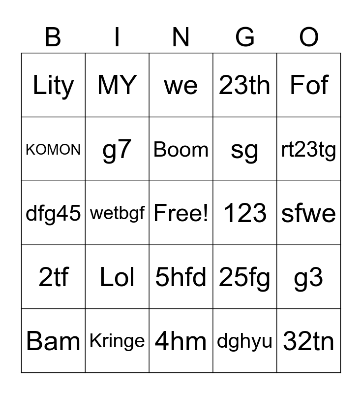 This bingo card has a free space and 24 words: Lol, Kringe, Boom, Bam, Fof, Lity, KOMON, MY, 123, 5hfd, sg, dfg45, 25fg, g3, g7, dghyu, sfwe, we, rt23tg, wetbgf, 32tn, 2tf, 23th and 4hm.