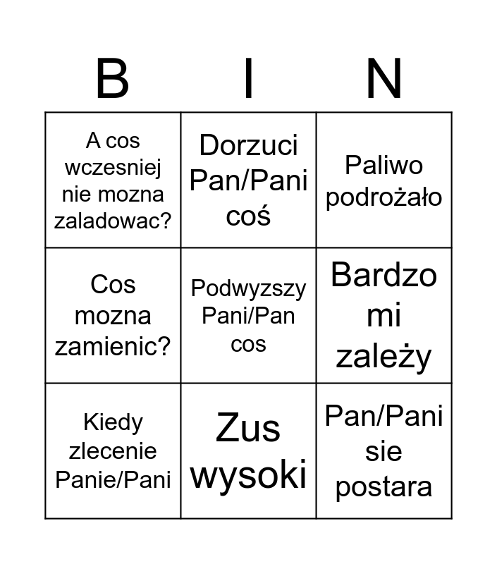 This bingo card has a free space and 8 words: Bardzo mi zależy, Paliwo podrożało, Dorzuci Pan/Pani coś, Kiedy zlecenie Panie/Pani, A cos wczesniej nie mozna zaladowac?, Pan/Pani sie postara, Cos mozna zamienic? and Zus wysoki.