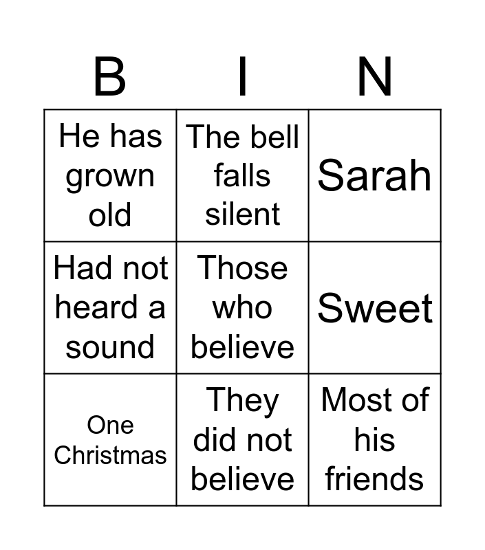 This bingo card has a free space and 8 words: Sweet, Sarah, The bell falls silent, One Christmas, He has grown old, Most of his friends, Had not heard a sound and They did not believe.