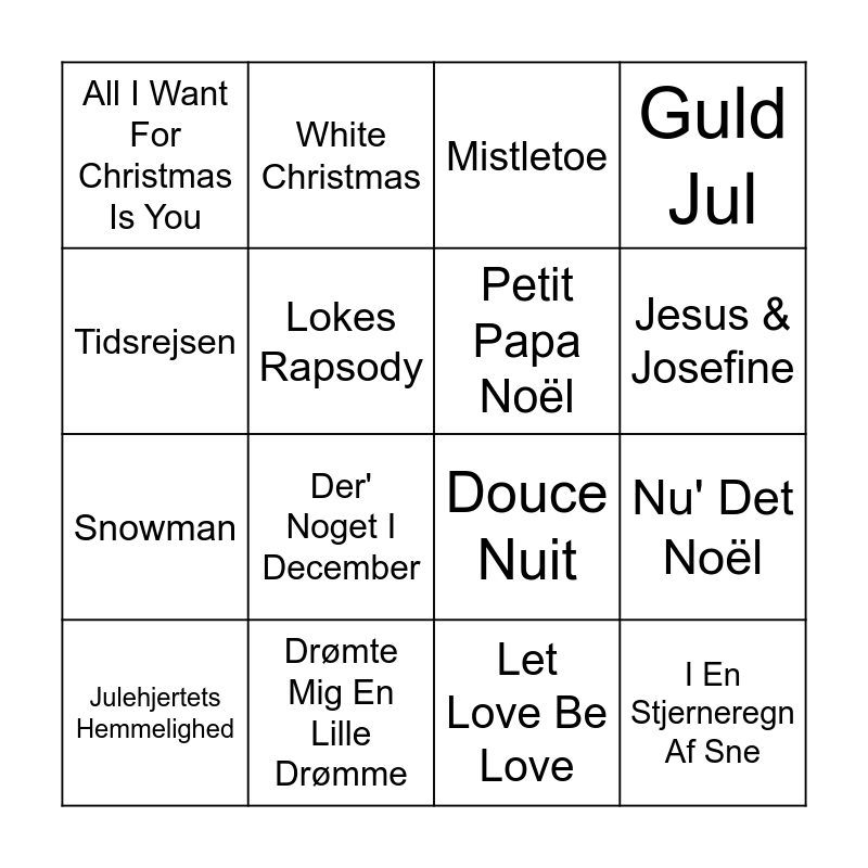 This bingo card has 40 words: Rudolph Le Petit Renne Au Nez Rouge, Douce Nuit, Vive Le Vent, Petit Papa Noël, Mon Beau Sapin, Jul i Valhal, Jesus & Josefine, Jul Det' Cool, Tidsrejsen, I En Stjerneregn Af Sne, Nu' Det Noël, Guld Jul, Julehjertets Hemmelighed, Let Love Be Love, Drømte Mig En Lille Drømme, Søren Banjomus, Santa Tell Me, All I Want For Christmas Is You, Jingle Bell Rock, Mistletoe, Underneath The Tree, It's Beginning To Look A Lot Like Christmas, Snowman, Lokes Rapsody, Jul På Vesterbro, Jul i Angora, Rockin' Around The Christmas Tree, Lysets Vej, Do They Know It's Christmas?, It's The Most Wonderful Time Of The Year, Happy Xmas (War Is Over), Santa's Coming For Us, Last Christmas, Tinka, Der' Noget I December, Kongespil, Wonderful Christmastime, Jingle Bells, White Christmas and Gudesang.
