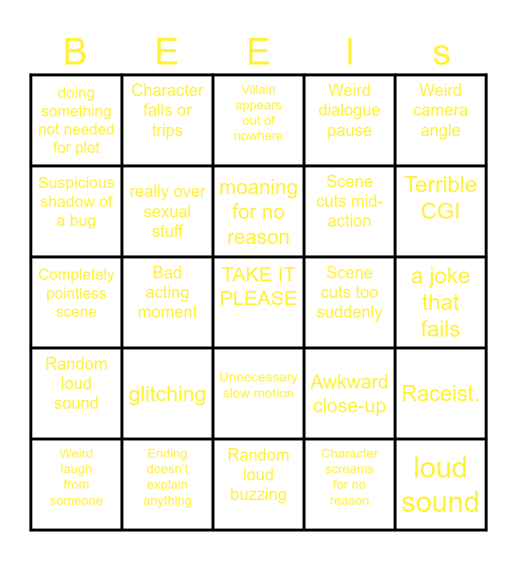 This bingo card has a free space and 27 words: Awkward close-up, Character says “What was that?”, Scene cuts mid-action, Random loud buzzing, Suspicious shadow of a bug, Villain appears out of nowhere, Character falls or trips, Random loud sound, Scene cuts too suddenly, Raceist., Completely pointless scene, Weird dialogue pause, Weird laugh from someone, Ending doesn’t explain anything, Terrible CGI, Awkward silence, really over sexual stuff, moaning for no reason, glitching, doing something not needed for plot, a joke that fails, Character screams for no reason, Bad acting moment, loud sound, Unnecessary slow motion, Weird camera angle and Jump scare that doesn’t land.