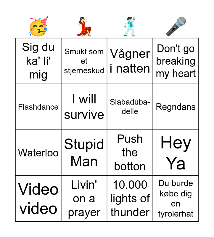 This bingo card has 60 words: You can't hurry love, Brown eyed girl, Lille sommerfugl, Du burde købe dig en tyrolerhat, Pas på den knaldrøde gummibåd, Maggie May, Slabaduba-delle, Crocodile Rock, Waterloo, Nam nam, Don't go breaking my heart, How deep is your love, I will survive, Disco Tango, Dit navn, dit nummer, Sig du ka' li' mig, Video video, Flashdance, Det' lige det, Regndans, Livin' on a prayer, Vågner i natten, Det er mig der står herude og banker på, Mr. Swing King, Elskes af dig, Bad Craziness, Familen kom til kaffe, The Sign, Stupid Man, I'm alive, Don't look back in anger, Say what you want, Believe, Jeg vil i seng med de fleste, Smukt som et stjerneskud, Der står et billede af dig på mit bord, Whenever Whereever, Hey Ya, From Paris to Berlin, Push the botton, Sommer i Europa, Copenhagen Airport, 10.000 lights of thunder, Back to the 80'es, Bad Romance, Gi' mig et smil, Moves like Jagger, Olivia, Shake it off, Strip no more, For evigt, Shape of you, Don't lie to me, Shallow, Blinding light, Cold Heart, Green green grass, Det modsatte, Du ligner din mor and Den nye pige.