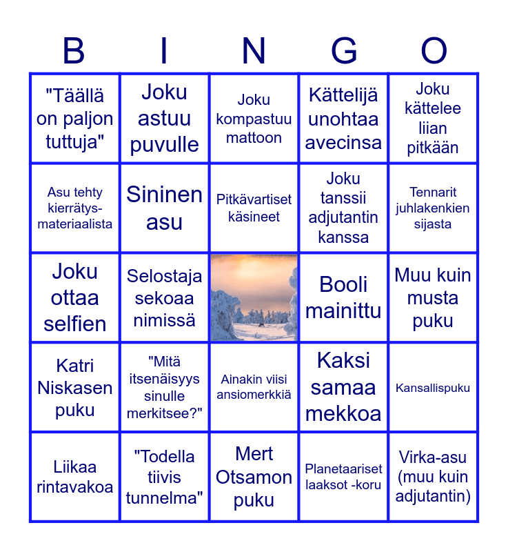 This bingo card has a free space and 24 words: "Mitä itsenäisyys sinulle merkitsee?", "Todella tiivis tunnelma", Pitkävartiset käsineet, Liikaa rintavakoa, Joku kättelee liian pitkään, "Täällä on paljon tuttuja", Asu tehty kierrätys-materiaalista, Joku astuu puvulle, Booli mainittu, Ainakin viisi ansiomerkkiä, Joku tanssii adjutantin kanssa, Joku ottaa selfien, Kaksi samaa mekkoa, Kansallispuku, Sininen asu, Planetaariset laaksot -koru, Muu kuin musta puku, Joku kompastuu mattoon, Tennarit juhlakenkien sijasta, Selostaja sekoaa nimissä, Virka-asu (muu kuin adjutantin), Katri Niskasen puku, Kättelijä unohtaa avecinsa and Mert Otsamon puku.