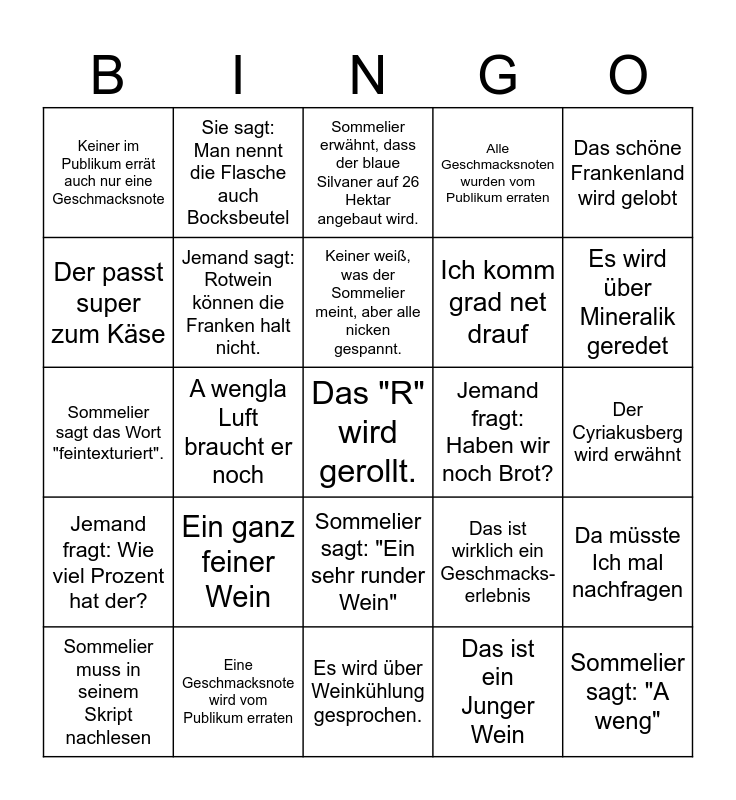 This bingo card has a free space and 24 words: Ein ganz feiner Wein, Eine Geschmacksnote wird vom Publikum erraten, Keiner weiß, was der Sommelier meint, aber alle nicken gespannt., Sommelier muss in seinem Skript nachlesen, Das schöne Frankenland wird gelobt, Keiner im Publikum errät auch nur eine Geschmacksnote, Der passt super zum Käse, Sie sagt: Man nennt die Flasche auch Bocksbeutel, Jemand fragt: Haben wir noch Brot?, Sommelier sagt: "Ein sehr runder Wein", Ich komm grad net drauf, Sommelier sagt das Wort "feintexturiert"., Das ist wirklich ein Geschmacks-erlebnis, Da müsste Ich mal nachfragen, Jemand sagt: Rotwein können die Franken halt nicht., Das ist ein Junger Wein, Der Cyriakusberg wird erwähnt, Sommelier erwähnt, dass der blaue Silvaner auf 26 Hektar angebaut wird., Es wird über Mineralik geredet, A wengla Luft braucht er noch, Sommelier sagt: "A weng", Jemand fragt: Wie viel Prozent hat der?, Alle Geschmacksnoten wurden vom Publikum erraten and Es wird über Weinkühlung gesprochen..