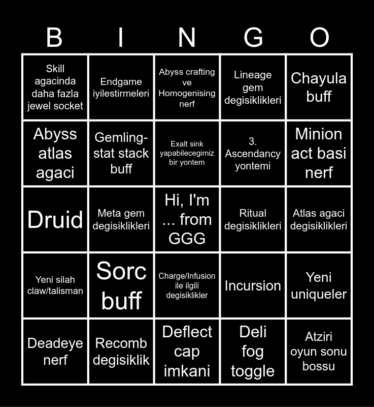 This bingo card has a free space and 24 words: Sorc buff, Recomb degisiklik, Exalt sink yapabilecegimiz bir yontem, Deadeye nerf, Chayula buff, Skill agacinda daha fazla jewel socket, Abyss atlas agaci, Endgame iyilestirmeleri, Ritual degisiklikleri, Charge/Infusion ile ilgili degisiklikler, 3. Ascendancy yontemi, Druid, Incursion, Yeni uniqueler, Gemling-stat stack buff, Deli fog toggle, Atlas agaci degisiklikleri, Abyss crafting ve Homogenising nerf, Minion act basi nerf, Meta gem degisiklikleri, Atziri oyun sonu bossu, Yeni silah claw/talisman, Lineage gem degisiklikleri and Deflect cap imkani.