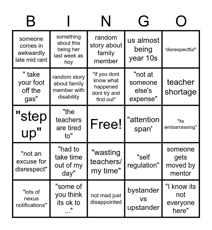 This bingo card has a free space and 31 words: not mad just disappointed, "lets end the year on a good note", "the teachers are tired to", "I dont understand you feel the need too...", someone comes in awkwardly late mid rant, random story about family member, random story about family member with disability, "self regulation", "attention span', bystander vs upstander, "its embarrassing", "I know its not everyone here", "some people are ruining for everyone", privilege, teacher shortage, "when I was your age...", someone gets moved by mentor, "had to take time out of my day", "not an excuse for disrespect", "wasting teachers/ my time", 'disrespectful", "raise the bar", "lots of nexus notifications", something about this being her last week as hoy, "not at someone else's expense", " take your foot off the gas", us almost being year 10s, "step up", "some of you think its ok to ...", "if you dont know what happened dont try and find out" and dont gossip.