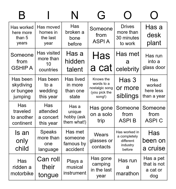 This bingo card has 38 words: Has traveled to another continent, Speaks more than one language, Plays a musical instrument, Has a cat, Has 3 or more siblings, Has worked here less than a year, Has worked here more than 5 years, Can roll their tongue, Has a hidden talent, Knows the words to a nostalgic song (you pick the song!), Has met a celebrity, Has run into a glass door, Has been skydiving or bungee jumping, Has visited more than 10 countries, Has lived in more than one state, Has gone on a solo trip, Has worked in a completely different industry before, Has a desk plant, Is an only child, Has moved homes in the last year, Has broken a bone before, Wears glasses or contacts, Drives more than 30 minutes to work, Has been on a cruise, Has ridden a motorbike, Has attended a concert this year, Has met someone famous by accident, Has gone camping in the last year, Has run a marathon, Has a pet that is not a cat or dog, Has taken public transport to work this week, Has been to a wedding this year, Has a unique hobby (ask them what!), Someone from ASPI A, Someone from ASPI B, Someone from ASPI C, Someone from GSHIP A and Someone from GSHIP C.