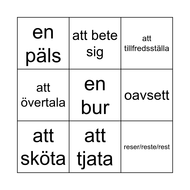 This bingo card has a free space and 8 words: oavsett, att tillfredsställa, att bete sig, att sköta, en päls, reser/reste/rest, att övertala and att tjata.