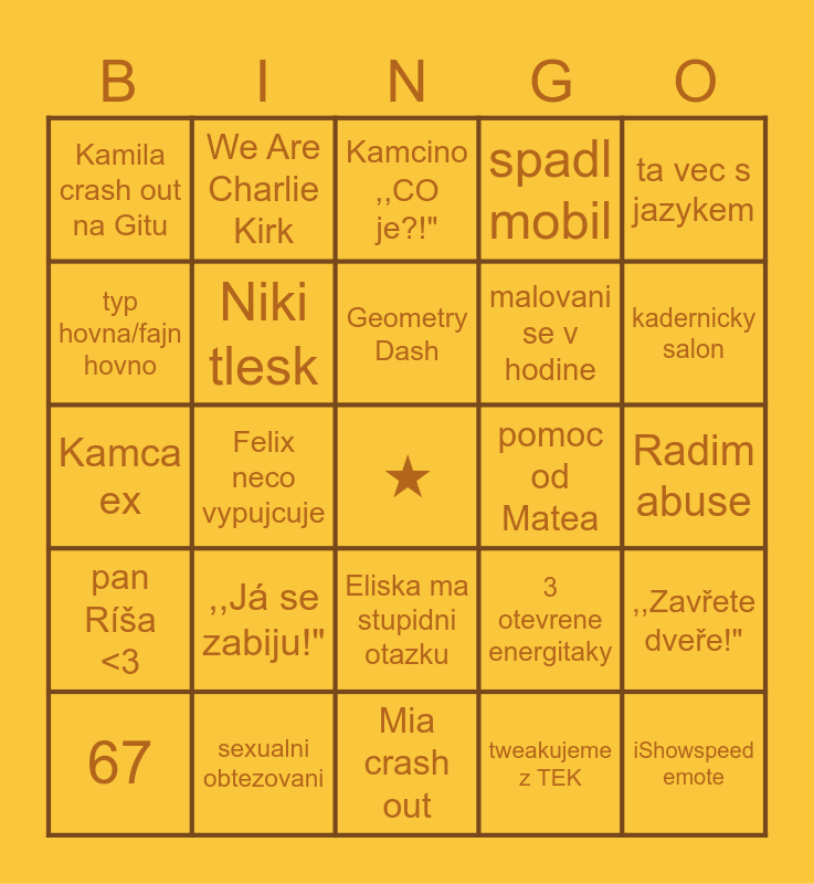 This bingo card has a free space and 24 words: ,,Já se zabiju!", sexualni obtezovani, Geometry Dash, 67, ta vec s jazykem, Kamila crash out na Gitu, typ hovna/fajn hovno, We Are Charlie Kirk, pomoc od Matea, Eliska ma stupidni otazku, malovani se v hodine, Kamca ex, 3 otevrene energitaky, ,,Zavřete dveře!", Niki tlesk, tweakujeme z TEK, Radim abuse, Kamcino ,,CO je?!", kadernicky salon, Felix neco vypujcuje, iShowspeed emote, pan Ríša <3, spadl mobil and Mia crash out.
