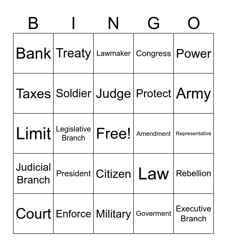 This bingo card has a free space and 24 words: President, Enforce, Judge, Court, Power, Bank, Taxes, Treaty, Amendment, Citizen, Protect, Limit, Law, Rebellion, Soldier, Goverment, Representative, Lawmaker, Army, Legislative Branch, Executive Branch, Judicial Branch, Congress and Military.