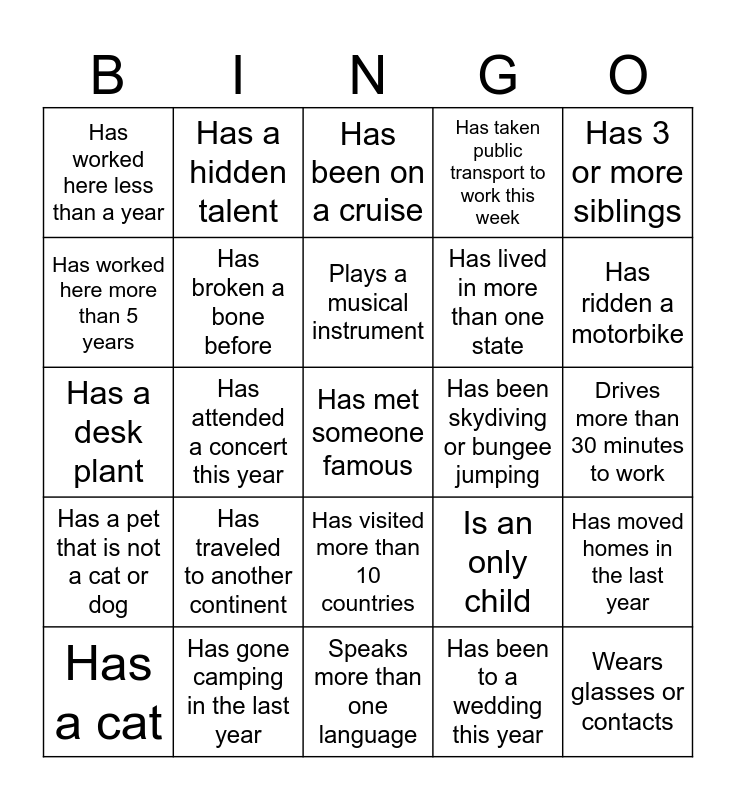This bingo card has 25 words: Has traveled to another continent, Speaks more than one language, Plays a musical instrument, Has a cat, Has 3 or more siblings, Has worked here less than a year, Has worked here more than 5 years, Has a hidden talent, Has been skydiving or bungee jumping, Has visited more than 10 countries, Has lived in more than one state, Has a desk plant, Is an only child, Has moved homes in the last year, Has broken a bone before, Wears glasses or contacts, Drives more than 30 minutes to work, Has been on a cruise, Has ridden a motorbike, Has attended a concert this year, Has met someone famous, Has gone camping in the last year, Has a pet that is not a cat or dog, Has taken public transport to work this week and Has been to a wedding this year.