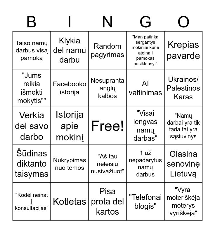 This bingo card has a free space and 24 words: Nukrypimas nuo temos, Kotletas, Nesupranta anglų kalbos, "Kodėl neinat į konsultacijas", Krepias pavarde, Taiso namų darbus visą pamoką, "Jums reikia išmokti mokytis"", Klykia del namu darbu, "Visai lengvas namų darbas", "Aš tau neleisiu nusivažiuot", AI vaflinimas, Verkia del savo darbo, 1 už nepadarytus namų darbus, Glasina senovinę Lietuvą, Facebooko istorija, "Telefonai blogis", "Namų darbai yra tik tada tai yra sąsiuvinys, Random pagyrimas, Ukrainos/ Palestinos Karas, Istorija apie mokinį, "Vyrai moteriškėja moterys vyriškėja", Šūdinas diktanto taisymas, "Man patinka sergantys mokiniai kurie ateina i pamokas pasiklausyt" and Pisa prota del kartos.