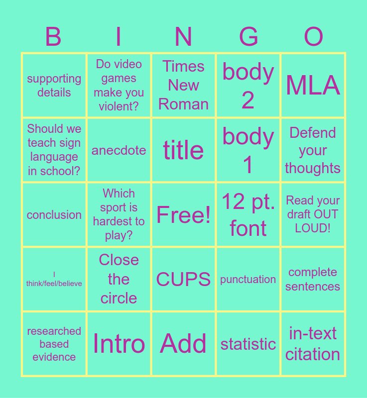 This bingo card has a free space and 59 words: hook, Intro, claim, I think/feel/believe, statistic, example, anecdote, transition, body 1, body 2, body 2, counterclaim, Should we teach sign language in school?, rebuttal, evidence, supporting details, in-text citation, MLA, Heading, title, 12 pt. font, Times New Roman, researched based evidence, complete sentences, NO fragments!, NO Run-ons, Precise language, Formal writing, Defend your thoughts, Dogs or cats?, School Uniforms?, Year-round school?, Should we teach sign language in school?, Online or traditional school?, Do video games make you violent?, Should athletes get paid so much?, City or country?, Which sport is hardest to play?, Cell phones in class?, conclusion, restate your claim in different words, Close the circle, Read your draft OUT LOUD!, rough draft, final draft, Revise, Edit, ARMS, CUPS, Add, remove, move, substitute, Capitalization, usage, punctuation, spelling, Indent each paragraph and Double space your essay.