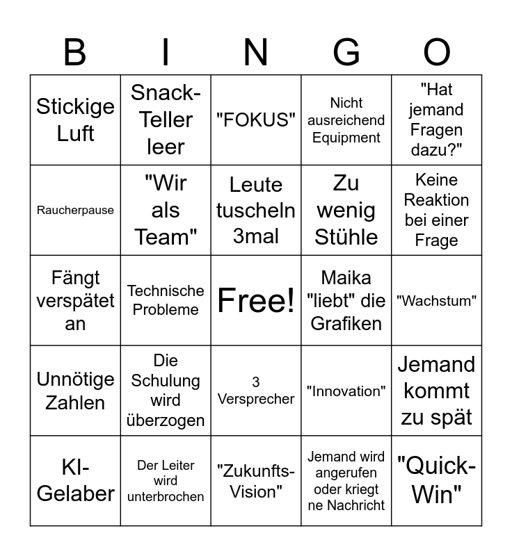 This bingo card has a free space and 24 words: Die Schulung wird überzogen, Der Leiter wird unterbrochen, Leute tuscheln 3mal, KI-Gelaber, "Hat jemand Fragen dazu?", Stickige Luft, Raucherpause, Snack-Teller leer, Maika "liebt" die Grafiken, 3 Versprecher, Zu wenig Stühle, Fängt verspätet an, "Innovation", Jemand kommt zu spät, "Wir als Team", Jemand wird angerufen oder kriegt ne Nachricht, "Wachstum", "FOKUS", Keine Reaktion bei einer Frage, Technische Probleme, "Quick-Win", Unnötige Zahlen, Nicht ausreichend Equipment and "Zukunfts-Vision".