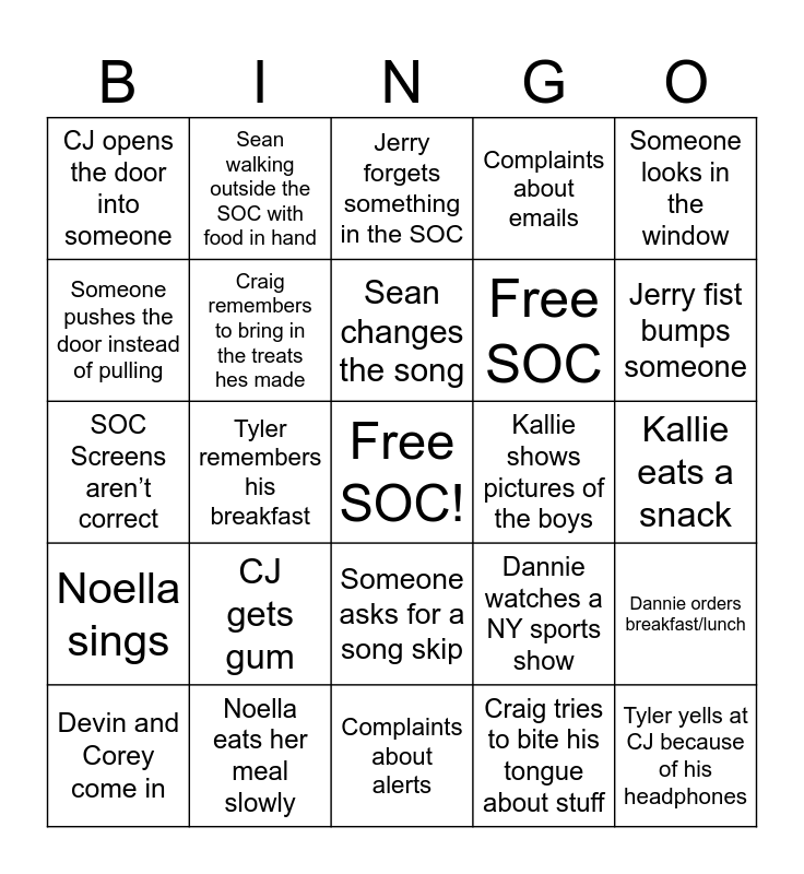 This bingo card has a free space and 24 words: CJ gets gum, Noella eats her meal slowly, Sean changes the song, Devin and Corey come in, Someone looks in the window, CJ opens the door into someone, Someone pushes the door instead of pulling, Sean walking outside the SOC with food in hand, Kallie shows pictures of the boys, Someone asks for a song skip, Free SOC, SOC Screens aren’t correct, Dannie watches a NY sports show, Dannie orders breakfast/lunch, Craig remembers to bring in the treats hes made, Craig tries to bite his tongue about stuff, Kallie eats a snack, Jerry forgets something in the SOC, Jerry fist bumps someone, Tyler remembers his breakfast, Tyler yells at CJ because of his headphones, Noella sings, Complaints about emails and Complaints about alerts.