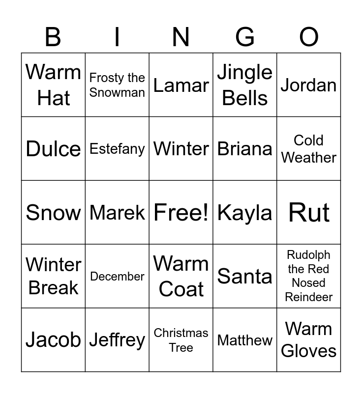 This bingo card has a free space and 24 words: December, Jeffrey, Winter, Jacob, Jordan, Warm Hat, Dulce, Frosty the Snowman, Kayla, Warm Coat, Briana, Snow, Santa, Rudolph the Red Nosed Reindeer, Estefany, Matthew, Rut, Lamar, Cold Weather, Marek, Warm Gloves, Winter Break, Jingle Bells and Christmas Tree.