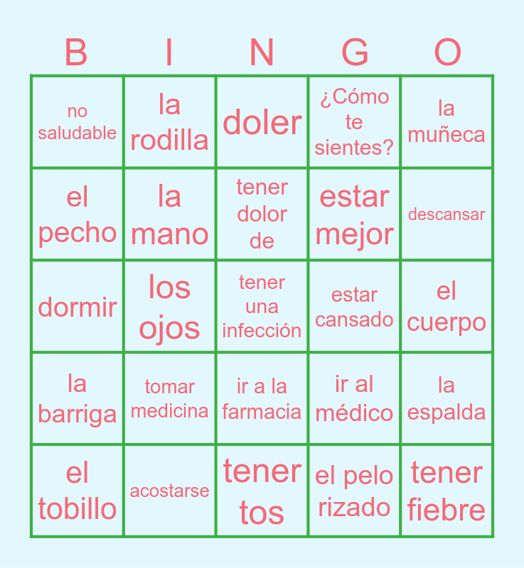 This bingo card has a free space and 33 words: la garganta, la cabeza, los ojos, el oído, la barriga, la mano, la muñeca, el tobillo, la rodilla, tener un resfriado, tener dolor de, doler, tener gripe, estar enfermo, estar cansado, descansar, acostarse, dormir, tomar medicina, ir al médico, ir a la farmacia, saludable, no saludable, el cuerpo, tener tos, tener fiebre, ¿Cómo te sientes?, estar mejor, el pecho, la espalda, el cuello, el pelo rizado and el pelo liso.
