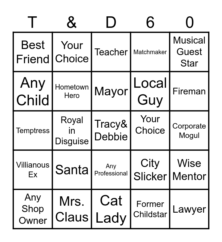 This bingo card has a free space and 24 words: Santa, Mrs. Claus, Mayor, Any Shop Owner, Musical Guest Star, Best Friend, Any Child, Your Choice, Your Choice, Any Professional, Local Guy, Temptress, City Slicker, Wise Mentor, Hometown Hero, Former Childstar, Corporate Mogul, Teacher, Fireman, Royal in Disguise, Lawyer, Villianous Ex, Matchmaker and Cat Lady.