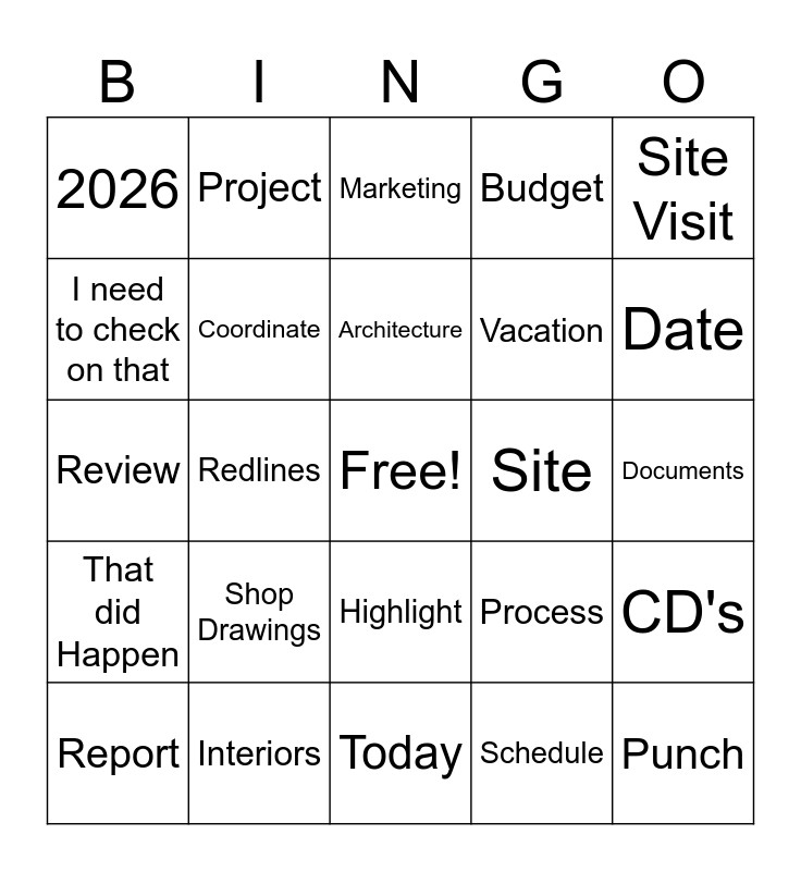 This bingo card has a free space and 59 words: CA, Interiors, Bid, That did Happen, Schedule, Change, Coordinate, Hours, Vacation, Float, Budget, Holiday, I need to check on that, Progress, December, 2026, Punch, Site Visit, Specifications, Architecture, Site, Marketing, Report, CD's, Preliminary, Possible, Revised, New, Date, Update, Schematic, Design, Engineer, Consultant, Project, Progress, Check, Redlines, Cost, Review, Drawing, Shop Drawings, Documents, Final, Ongoing, Begin, End, This week, Highlight, Today, Next week, Finish, Old, Hardware, Submittal, Process, Not yet, Good idea and Update.