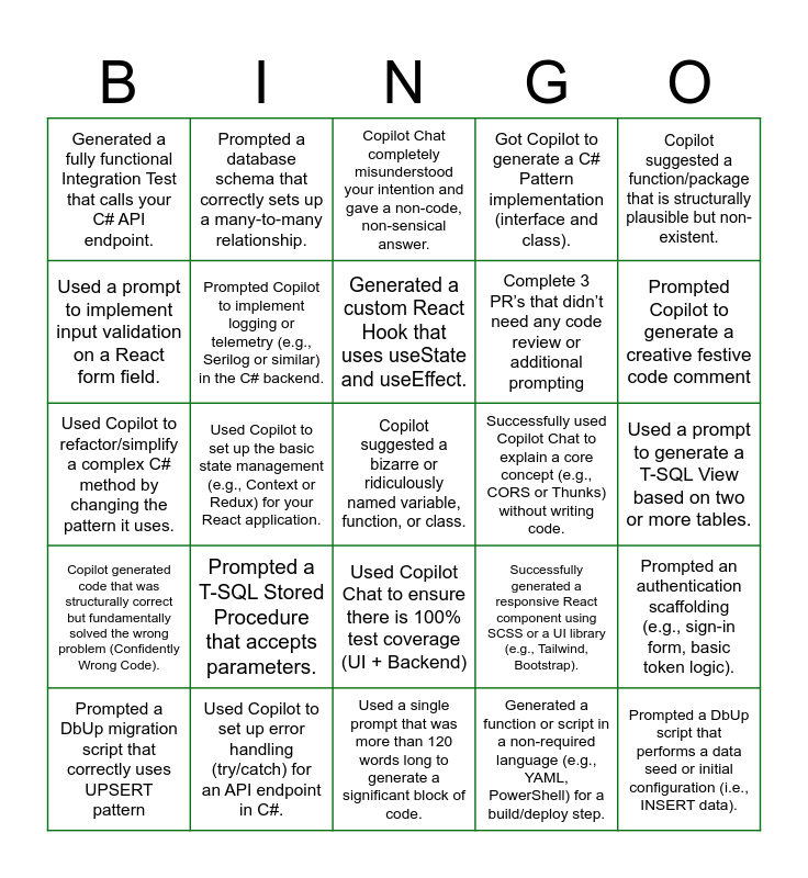 This bingo card has a free space and 24 words: Prompted a T-SQL Stored Procedure that accepts parameters., Used Copilot to set up error handling (try/catch) for an API endpoint in C#., Generated a custom React Hook that uses useState and useEffect., Prompted a DbUp migration script that correctly uses UPSERT pattern, Copilot suggested a function/package that is structurally plausible but non-existent., Generated a fully functional Integration Test that calls your C# API endpoint., Used a prompt to implement input validation on a React form field., Prompted a database schema that correctly sets up a many-to-many relationship., Successfully used Copilot Chat to explain a core concept (e.g., CORS or Thunks) without writing code., Used Copilot Chat to ensure there is 100% test coverage (UI + Backend), Complete 3 PR’s that didn’t need any code review or additional prompting, Used Copilot to refactor/simplify a complex C# method by changing the pattern it uses., Successfully generated a responsive React component using SCSS or a UI library (e.g., Tailwind, Bootstrap)., Prompted an authentication scaffolding (e.g., sign-in form, basic token logic)., Prompted Copilot to implement logging or telemetry (e.g., Serilog or similar) in the C# backend., Generated a function or script in a non-required language (e.g., YAML, PowerShell) for a build/deploy step., Used a prompt to generate a T-SQL View based on two or more tables., Copilot Chat completely misunderstood your intention and gave a non-code, non-sensical answer., Prompted Copilot to generate a creative festive code comment, Used Copilot to set up the basic state management (e.g., Context or Redux) for your React application., Prompted a DbUp script that performs a data seed or initial configuration (i.e., INSERT data)., Copilot generated code that was structurally correct but fundamentally solved the wrong problem (Confidently Wrong Code)., Got Copilot to generate a C# Pattern implementation (interface and class). and Used a single prompt that was more than 120 words long to generate a significant block of code..