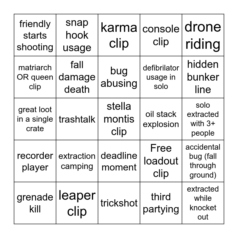 This bingo card has 25 words: extraction camping, trickshot, bug abusing, grenade kill, drone riding, friendly starts shooting, matriarch OR queen clip, snap hook usage, oil stack explosion, deadline moment, defibrilator usage in solo, great loot in a single crate, Free loadout clip, accidental bug (fall through ground), fall damage death, extracted while knocket out, solo extracted with 3+ people, karma clip, hidden bunker line, trashtalk, stella montis clip, leaper clip, recorder player, console clip and third partying.