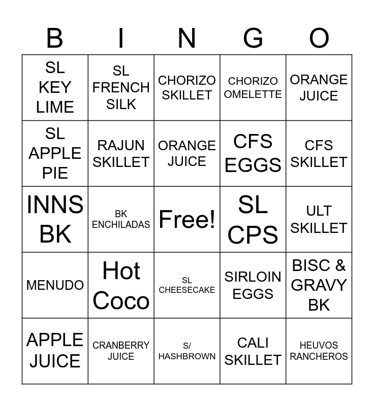 This bingo card has a free space and 24 words: Hot Coco, CRANBERRY JUICE, ORANGE JUICE, APPLE JUICE, ORANGE JUICE, SL KEY LIME, SL APPLE PIE, SL FRENCH SILK, SL CPS, SL CHEESECAKE, CFS EGGS, INNS BK, SIRLOIN EGGS, BISC & GRAVY BK, RAJUN SKILLET, CALI SKILLET, ULT SKILLET, CHORIZO SKILLET, CFS SKILLET, BK ENCHILADAS, HEUVOS RANCHEROS, MENUDO, CHORIZO OMELETTE and S/ HASHBROWN.