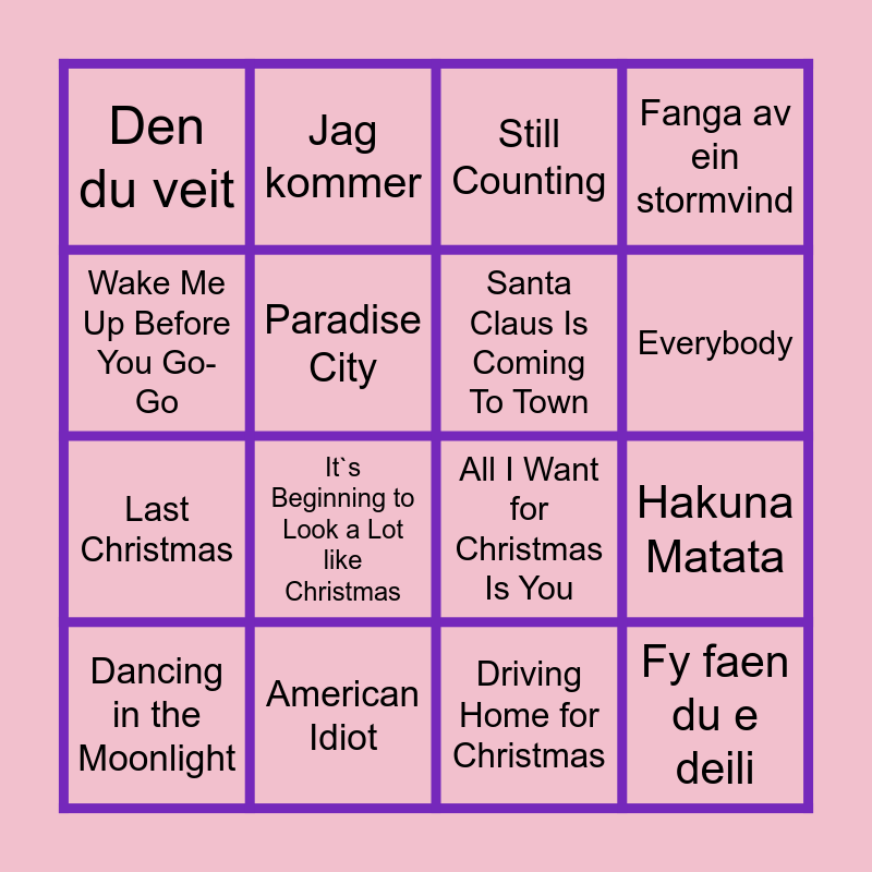 This bingo card has 24 words: Girls Just Want to Have Fun, 5 fine frøkner, Everybody, Moves Like Jagger, Wake Me Up Before You Go-Go, Den du veit, Paradise City, Jag kommer, American Idiot, Poker Face, Last Christmas, All I Want for Christmas Is You, Merry Christmas Everyone, Rockin` Around The Christmas Tree, Santa Claus Is Coming To Town, Snowman, Driving Home for Christmas, Still Counting, It`s Beginning to Look a Lot like Christmas, Hakuna Matata, Dancing in the Moonlight, Fy faen du e deili, Fanga av ein stormvind and Don`t Stop Me Now.