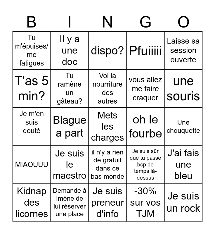 This bingo card has a free space and 24 words: Je suis le maestro, Demande à Imène de lui réserver une place, Vol la nourriture des autres, Kidnap des licornes, Laisse sa session ouverte, Tu m'épuises/ me fatigues, T'as 5 min?, Il y a une doc, oh le fourbe, il n'y a rien de gratuit dans ce bas monde, vous allez me faire craquer, Je m'en suis douté, Je suis sûr que tu passe bcp de temps là-dessus, J'ai fais une bleu, Tu ramène un gâteau?, -30% sur vos TJM, Une chouquette, dispo?, une souris, Blague a part, Je suis un rock, MIAOUUU, Pfuiiiii and Je suis preneur d'info.