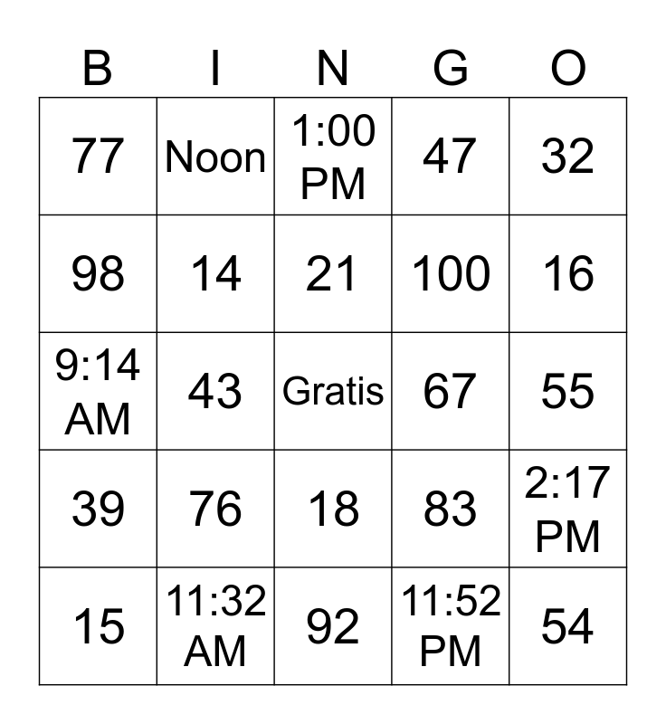 This bingo card has a free space and 39 words: 0, 6, 11, 14, 15, 18, 21, 27, 32, 39, 43, 47, 54, 55, 67, 76, 66, 77, 80, 83, 98, 92, 100, 16, 12, 2, 13, 8:30 AM, 8:15 PM, Noon, Midnight, 1:00 AM, 1:00 PM, 11:32 AM, 11:52 PM, 2:07 AM, 2:17 PM, 9:14 AM and 9:54 PM.