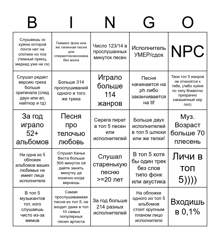 This bingo card has 35 words: Песня из-за одного момента в топ 5 (тикток хуйня), Самый прослушиваемый трек не в твоем любимом жанре, В топ 5 какашка из аниме или игр или сериалов ну крч ост, Больше 314 прослушиваний одного и того же трека, Слушал старенькую песню >=20 лет, Исполнитель УМЕР/сдох, Слушал редакт версию трека больше оригинала (спид даун или ап, найткор и тд), Минимум 3 жанра одинаковых (призрачный хуй в поп, крутой топовый типтоп и умерший хип-хоп), Играло больше 114 жанров, За год играло больше 514 треков, За год играло 52+ альбомов, NPС, Песня для телок вы уже знаете, Топ 5 Музыкант стример/ютубер похуй, Слушаешь ск хуйню которой почти нет на спотике но пох (темный принц, медкид уже не ск), Больше двух исполнителей в топ 5 шлюхи или же телки!, На обложке одного из топ 5 альбомов стоит крупным планом лицо исполнителя, Песня про телочью любовь, Ни одна из 5 обложек альбомов ваших любимых не имеет лица исполнителя, Серега пират в топ 5 песен или исполнителей, В топ 5 хотя бы один трек без слов типо фонк или акустика, В топ 5 музыкантов тот, кого слушаешь чисто из-за мемов, Личи в топ 5)))), Самая прослушиваемая песня из топ 5, не входит даже в топ 10 самых популярных песен артиста, Число 123/14 в прослушанных минуток песен, Твои топ 5 жанров не относятся к тебе, (либо хуйня по типу блевотно призрачно какашечный хир поп), Входишь в 0,1%, В топ 5 больше 3 снг уебков, Песня начинается на ph либо заканчивается на tif, Муз. Возраст больше 70 плесень, Муз. Возраст меньше 18 школота, За год больше 214 разных исполнителей, Слушал Канье Веста больше 500 минуток ой дайте занять минутку да конечно когда вернешь, Гейминг фонк или же типичная песня для спермотоксикозника без мозга and 3/5 артистов из одной и той же страны.