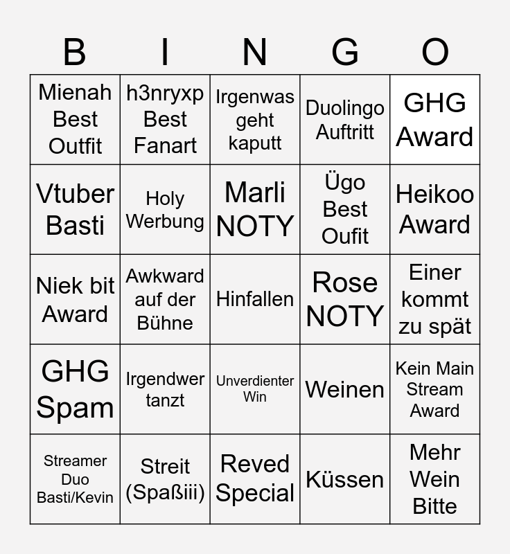 This bingo card has a free space and 24 words: Streamer Duo Basti/Kevin, Irgendwer tanzt, Marli NOTY, Küssen, GHG Award, Mienah Best Outfit, h3nryxp Best Fanart, Irgenwas geht kaputt, Rose NOTY, Einer kommt zu spät, Niek bit Award, Holy Werbung, Weinen, Kein Main Stream Award, Vtuber Basti, Streit (Spaßiii), Reved Special, Duolingo Auftritt, Heikoo Award, GHG Spam, Awkward auf der Bühne, Unverdienter Win, Ügo Best Oufit and Mehr Wein Bitte.