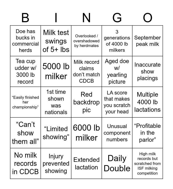 This bingo card has a free space and 24 words: No milk records in CDCB, “Limited showing”, Milk record claims don’t match CDCB, Daily Double, September peak milk, Doe has bucks in commercial herds, Milk test swings of 5+ lbs, Overlooked / overshadowed by herdmates, LA score that makes you scratch your head, Multiple 4000 lb lactations, “Easily finished her championship”, 5000 lb milker, Unusual component numbers, “Profitable in the parlor”, Tea cup udder w/ 3000 lb record, Injury prevented showing, Extended lactation, 3 generations of 4000 lb milkers, Inaccurate show placings, “Can’t show them all”, 1st time shown was nationals, 6000 lb milker, Aged doe w/ yearling picture and High milk records but scratched from ISF milking competition.
